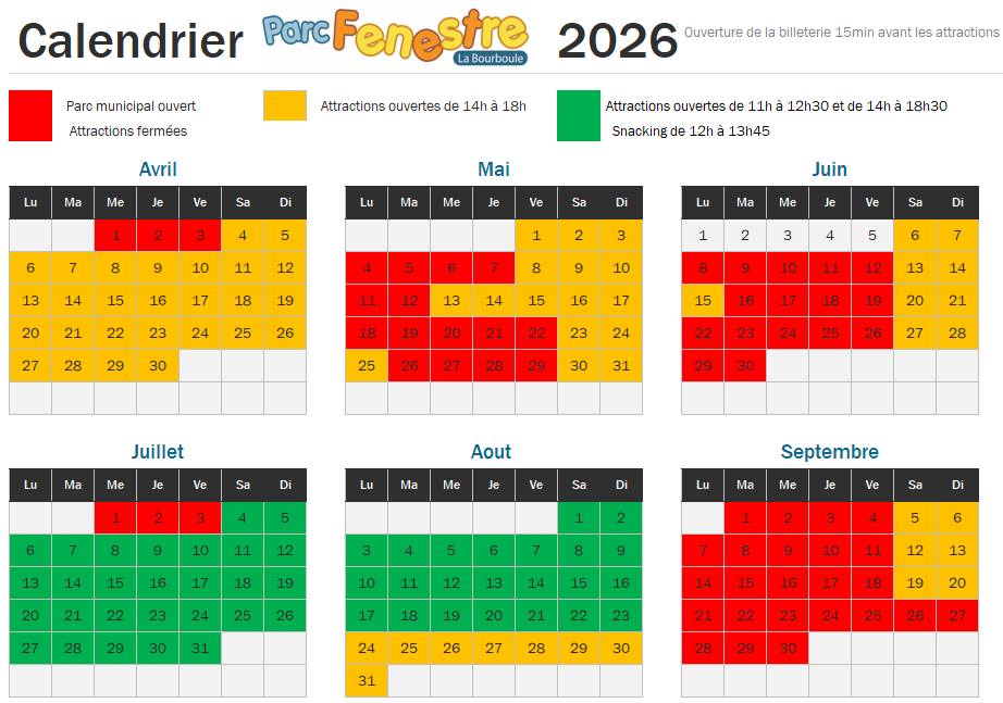 Les horaires et dates d’ouverture sont susceptibles d’être modifiés sans préavis selon l’évolution du calendrier scolaire, des conditions météorologiques, sanitaires et selon l’affluence.