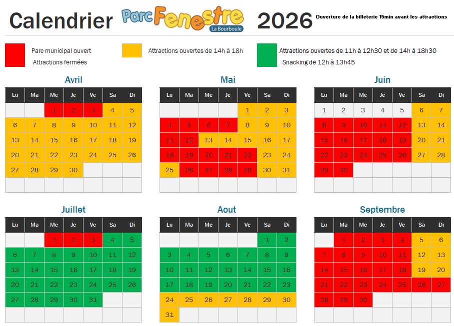 Les horaires et dates d’ouverture sont susceptibles d’être modifiés sans préavis selon l’évolution du calendrier scolaire, des conditions météorologiques, sanitaires et selon l’affluence.